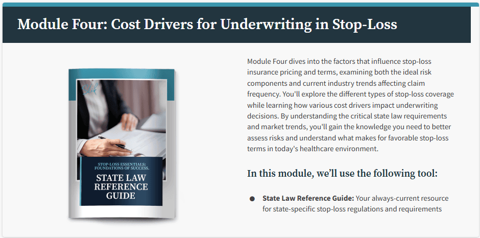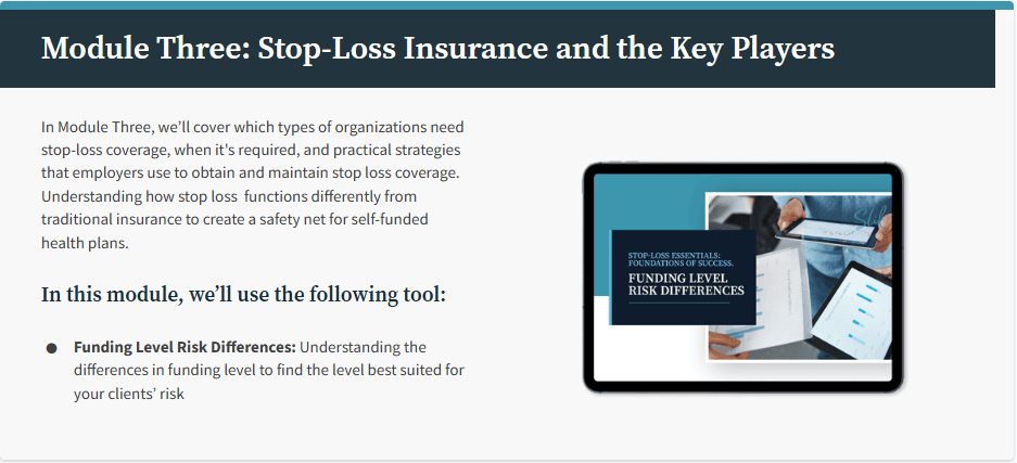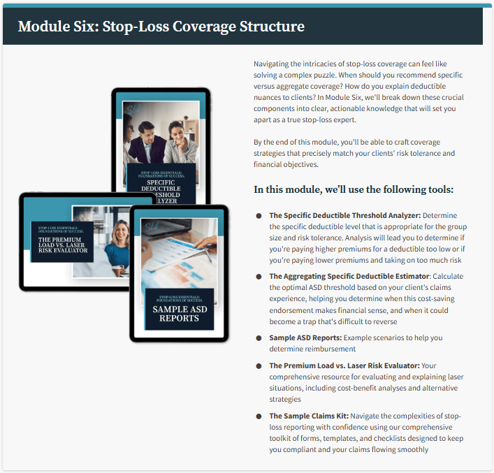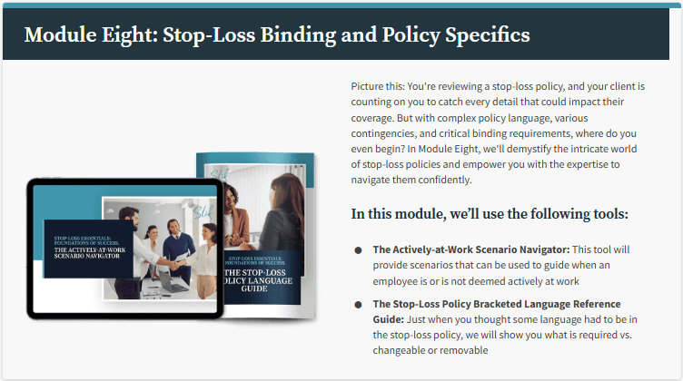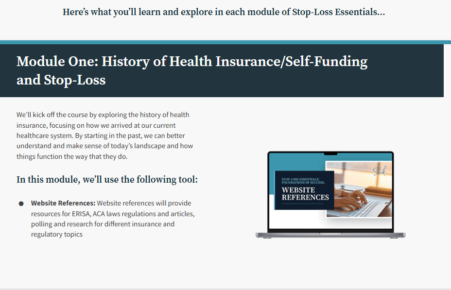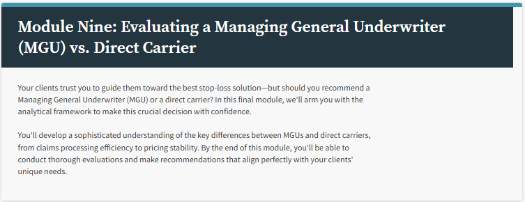 Stop-Loss Essentials is a 9-module online course that will teach you the ins and outs of stop-loss insurance to give you the knowledge and confidence you need to provide the care and service your customers need.